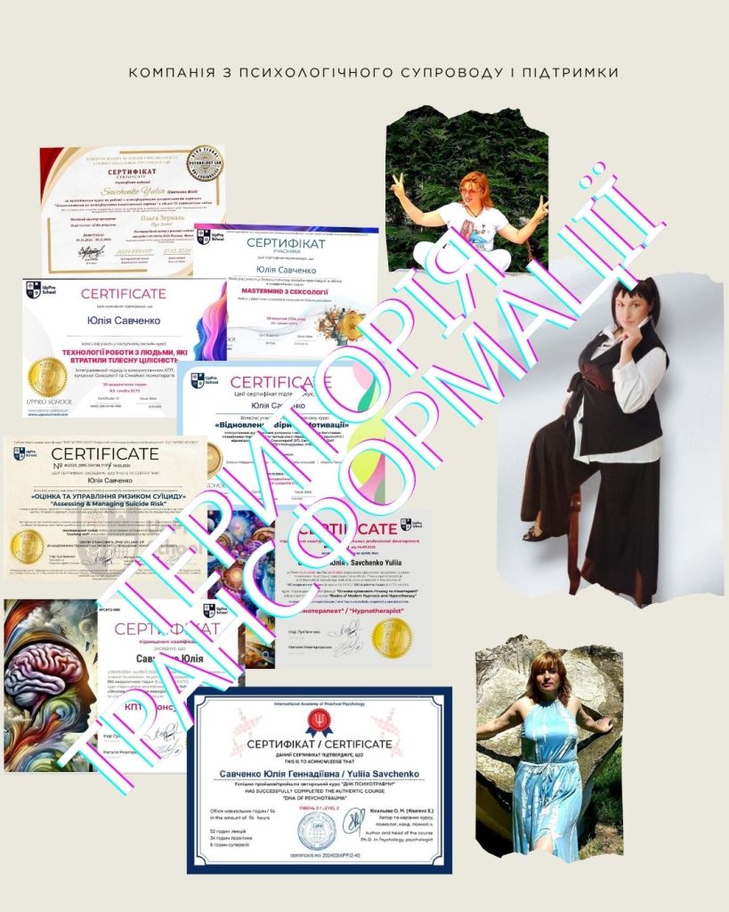 Маю понад 300 годин терапевтичної практики та більше 60 годин власної терапії, що дозволяє мені працювати з людьми не лише як фахівцю, а й як людині, яка пройшла глибинні внутрішні процеси.