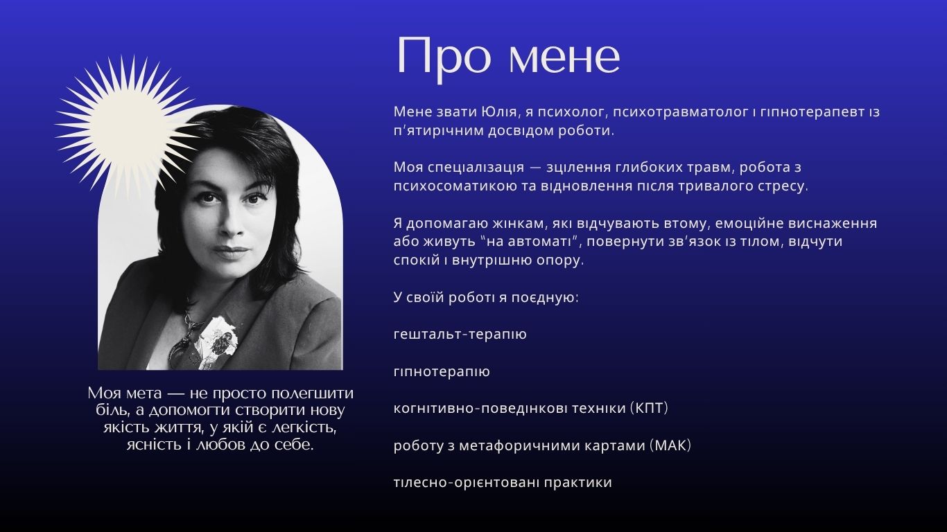 Я — Юлія, психолог, психотравматолог, гіпнотерапевт та авторка програм трансформації.